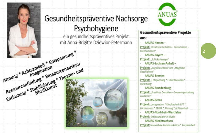 - Die Leiterin für Selbsthilfe und Integration beim BV ANUAS e.V. wird über die gesundheitspräventive Arbeit des ANUAS im Jahr 2020 informieren.