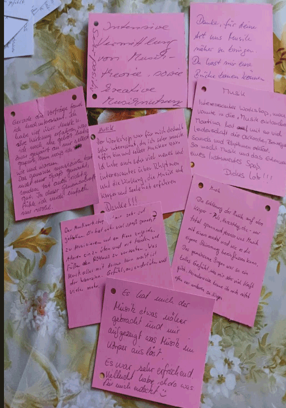 Martina vermittelt mit viel Können, Empathie und Spaß den Teilnehmern viel Wissenswertes zum Thema Musik, Singen, Keyboard spielen. Alle Teilnehmer hatten viel Spaß und einige haben für sich entschieden, sich ein Instrument zu kaufen und später zur Stressbewältigung Musik zu machen.